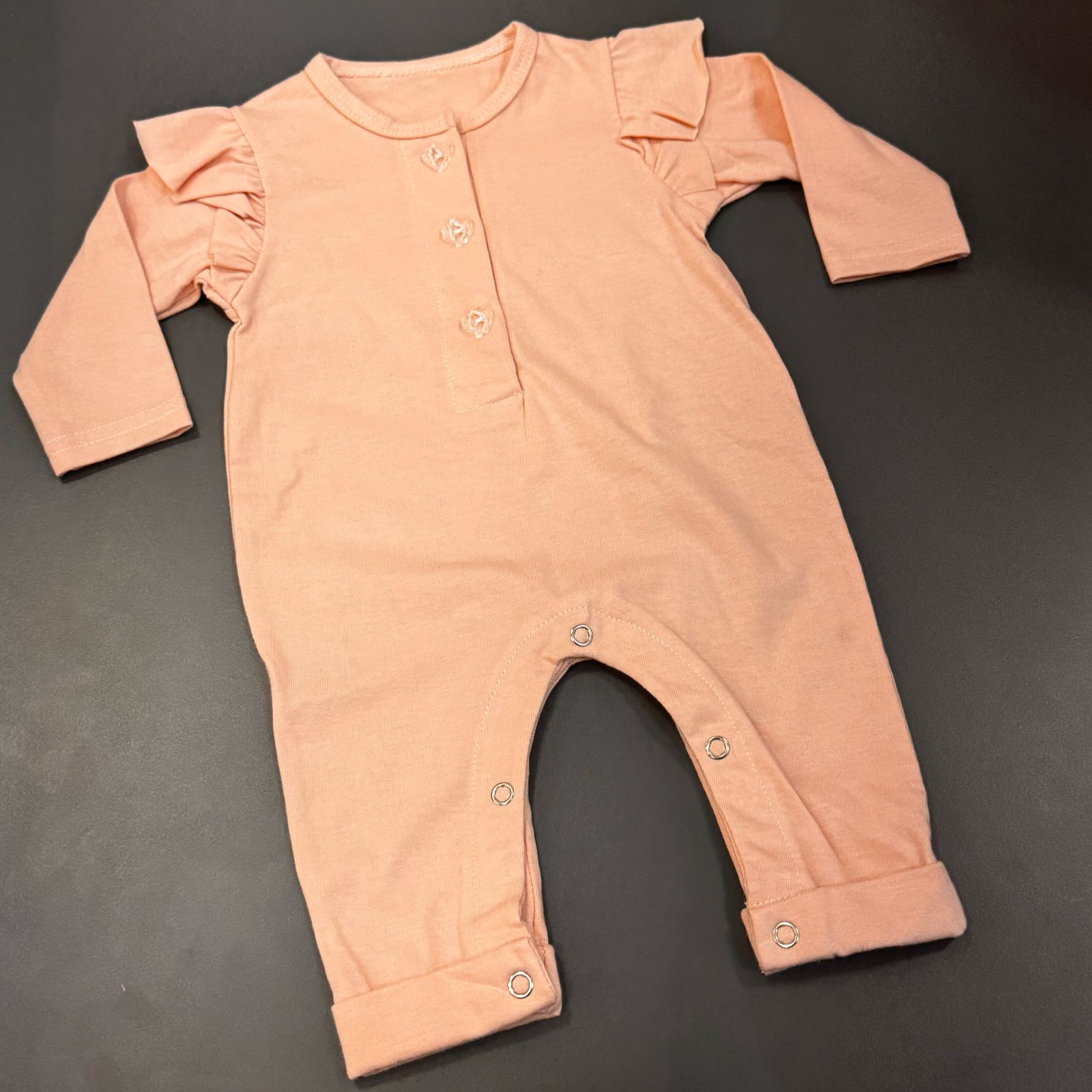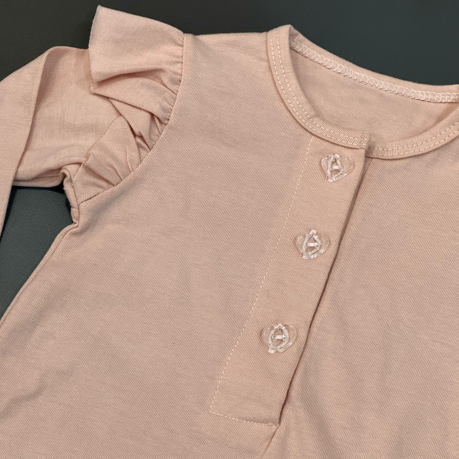Enterito de algodon sin pie, con detalle de volados en el contorno de la manga, con una carterita que cueta con unos botones en forma de corazon que completan este look super romantico.