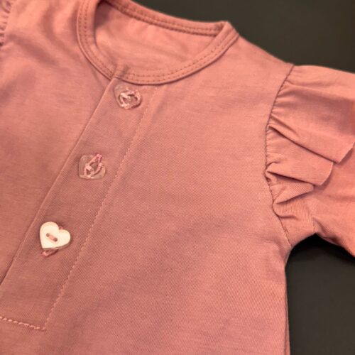 Enterito de algodon sin pie, con detalle de volados en el contorno de la manga, con una carterita que cueta con unos botones en forma de corazon que completan este look super romantico.