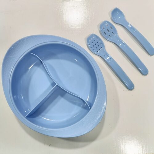 Plato con divisiones, ideal para la alimentación de tu bebé, tine buena capacidad. Viene con 3 cucharas diferentes para que tu bebé pueda alimentarse solo!